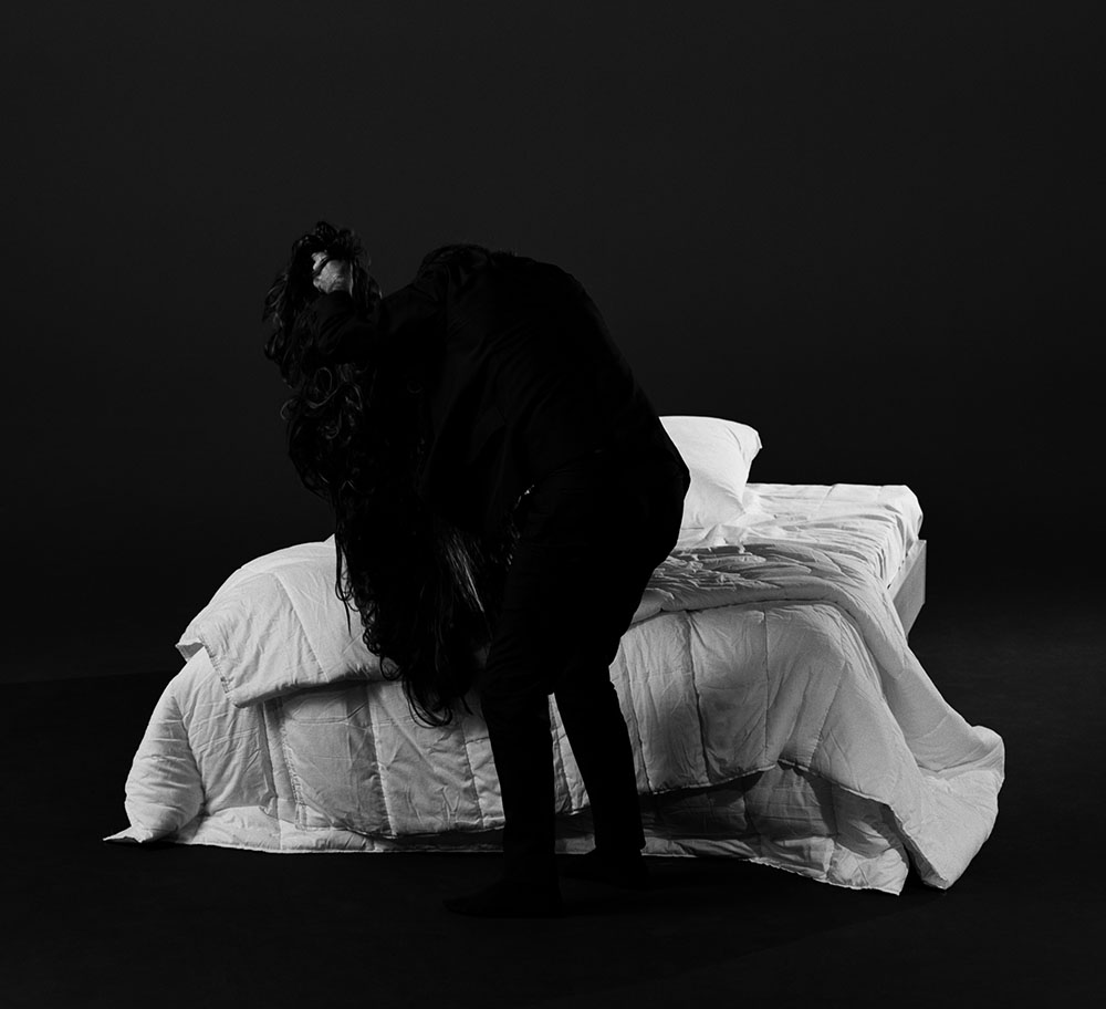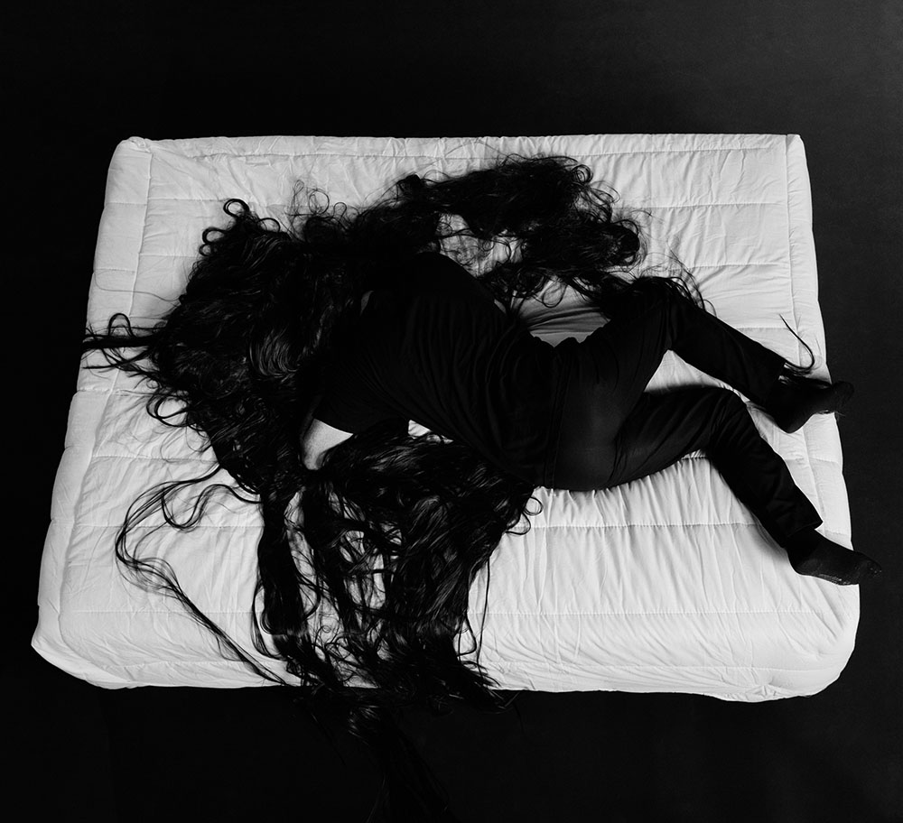 My latest group of works, which has not yet been entirely published, is called Wackelkontakt. Part of it, which your question refers to, is entitled Ästhetische Paranoia. Me, a big white bed and 3,6 meters of long black hair in an undefined room. Sensual and cold, hot and narrow, serious and ridiculous: moments of these ceremonial and paranoid moments picture ecstasy. Unspeakable and unexplainable areas have become images. Everything is about being alone in space and in the world. What is important for me is to give room to new ideas and visions inviting the observer to immerse into another world.