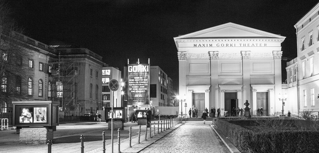 The Maxim Gorki Theater is the smallest of Berlin’s ensemble theaters, located on the boulevard Unter den Linden in the heart of the city. Shermin Langhoff and Jens Hillje have been the artistic directors of the Gorki since the 2013/2014 season. The institution is shaped by an 18-member international ensemble, the four resident directors Nurkan Erpulat, Sebastian Nübling, Yael Ronen, and Hakan Savaş Mican, the in-house author Marianna Salzmann, and approximately 160 additional staff members. The repertoire on the main stage, as well as that of Studio Я, reflects Berlin as a zone of conflict—where questions of identity are contested, where people resist imposed labels, and where diversity is demanded.