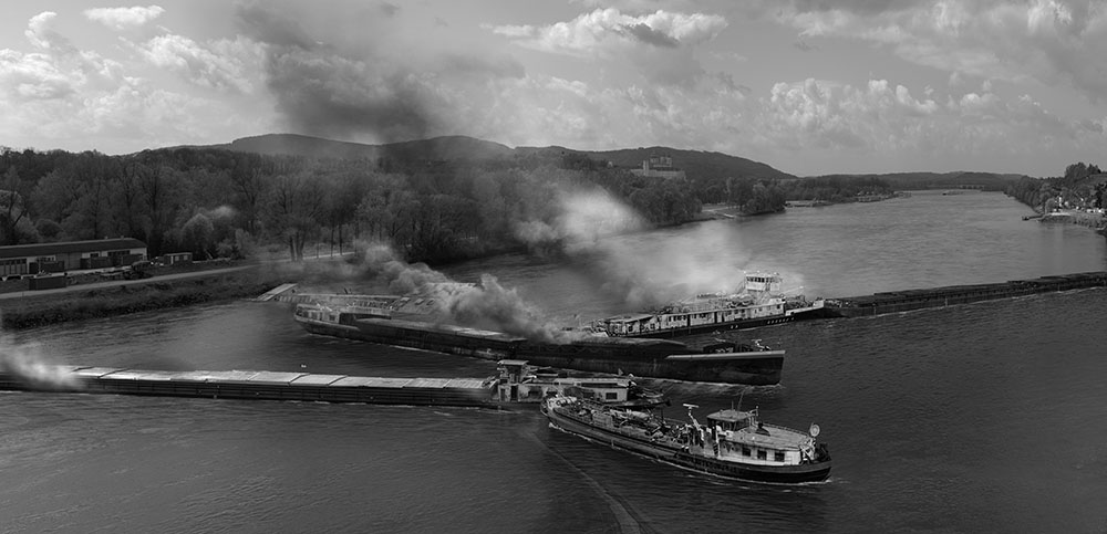 The large-format billboard (6 x 2 meters) shows a panoramic view of the Danube near Melk (Austria), the town closest to the billboard‘s location at Schallaburg. Cargo shipping of the kind seen is common on the Danube, carrying some 10 million tonnes of freight a year into and out of Austria or straight through it. But the ships on the poster are wedged together and some have run aground. Smoke rises and parts of the ships are charred. Diesel spills visibly onto the surface of the water.