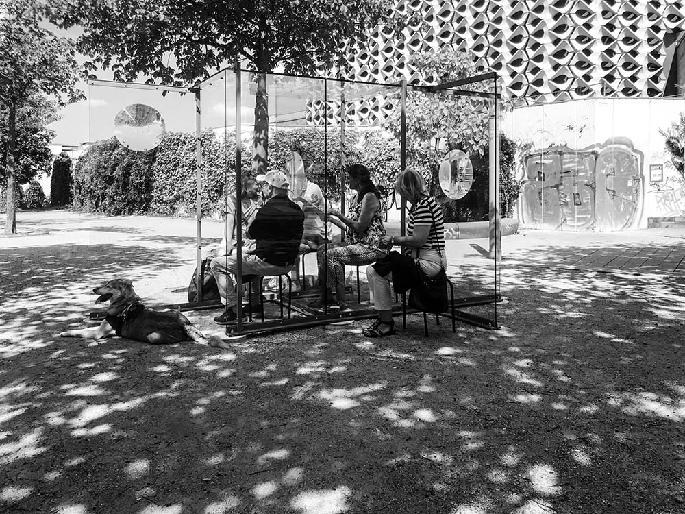 The architectural sculpture, a pavilion made of transparent acrylic glass panels, serves both a separating and connecting function. In its formal and functional design, it is reminiscent of a counter situation that is often found in official contexts and which is increasingly being used in areas of public contact, especially during the measures to contain the COVID-19 virus. (Anna Witt, excerpt from her catalogue contribution to GEGENWARTEN/PRESENCES, Kunst Stadt Chemnitz, 2020)