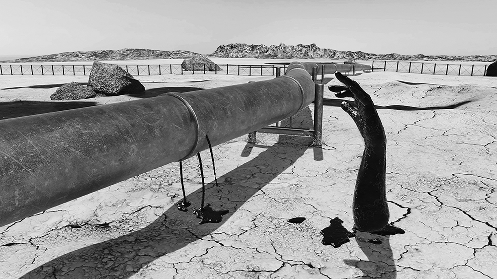 V: That image in The Leaking Bodies with the pipeline and the hand emerging from the ground or the desert—it’s actually quite a direct visualization. Although this is a digital image, it is a very human realization.