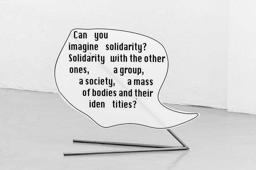 „Becoming giants,“ she now mumbles quietly and with ease, „we know our body only in parts. We have to bend in an attempt to see, leave the center for the periphery. „ She rhymes sometimes, but then she continues seriously: „Can you imagine solidarity? Solidarity with the other ones, a group, a society, a mass of bodies and their identities?“