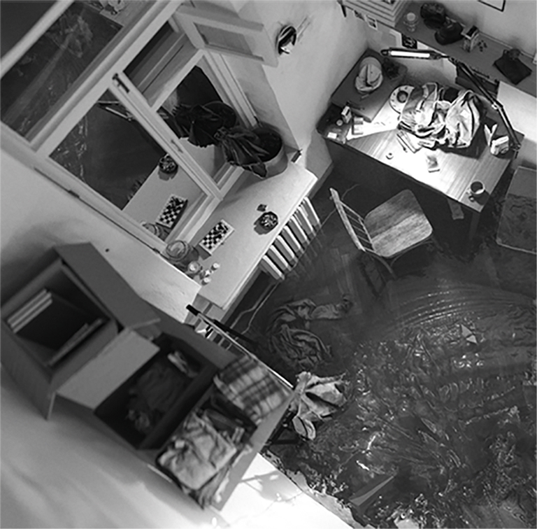 My work is an image that refers to a private room in Kyiv where I lived between 2019 and 2021. This space holds a special meaning for me as it embodies my first experience of living independently, away from my parents. I use a three-dimensional modeling program to blend my memories with a digital environment, creating a unique scenography and producing a rendered image. It offers a top-down view and the scene depicts a flood. With this work I aim to explore the tension between memories of daily life in the past and my present sensations.