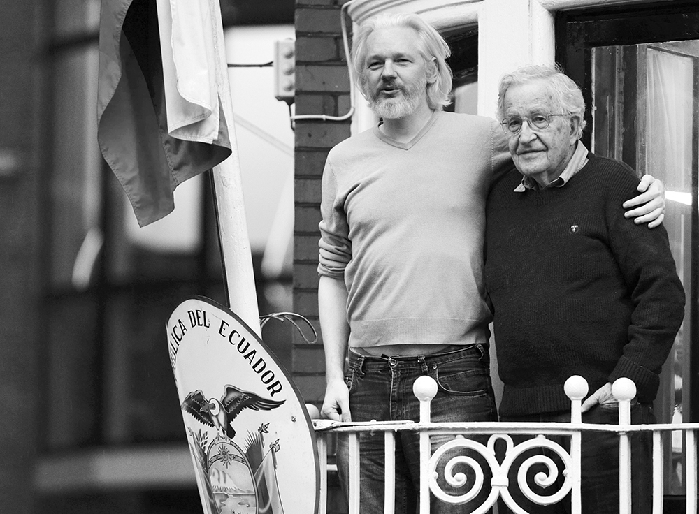Chomsky: Well, Julian Assange committed a major crime. He acted as an honest journalist. Can‘t have that. There are things that systems of power want to be concealed from the population. Assange violated that. He brought to the general population information that they have every right to have and that power systems don‘t want them to have. Information about war crimes, for example. That‘s a crime. You have to be punished for that. So, he‘s been kept in conditions of virtual torture for six years now. First isolated in an apartment, the Ecuadorian embassy is a small apartment. I visited him there. He had fewer rights than a prisoner on death row who can at least walk outside and see the sun; not Assange. Then the British put him in a high security prison for the crime of not paying bail. The UN Rapporteur on Torture simply described this as torture. He is personally frankly destroyed.